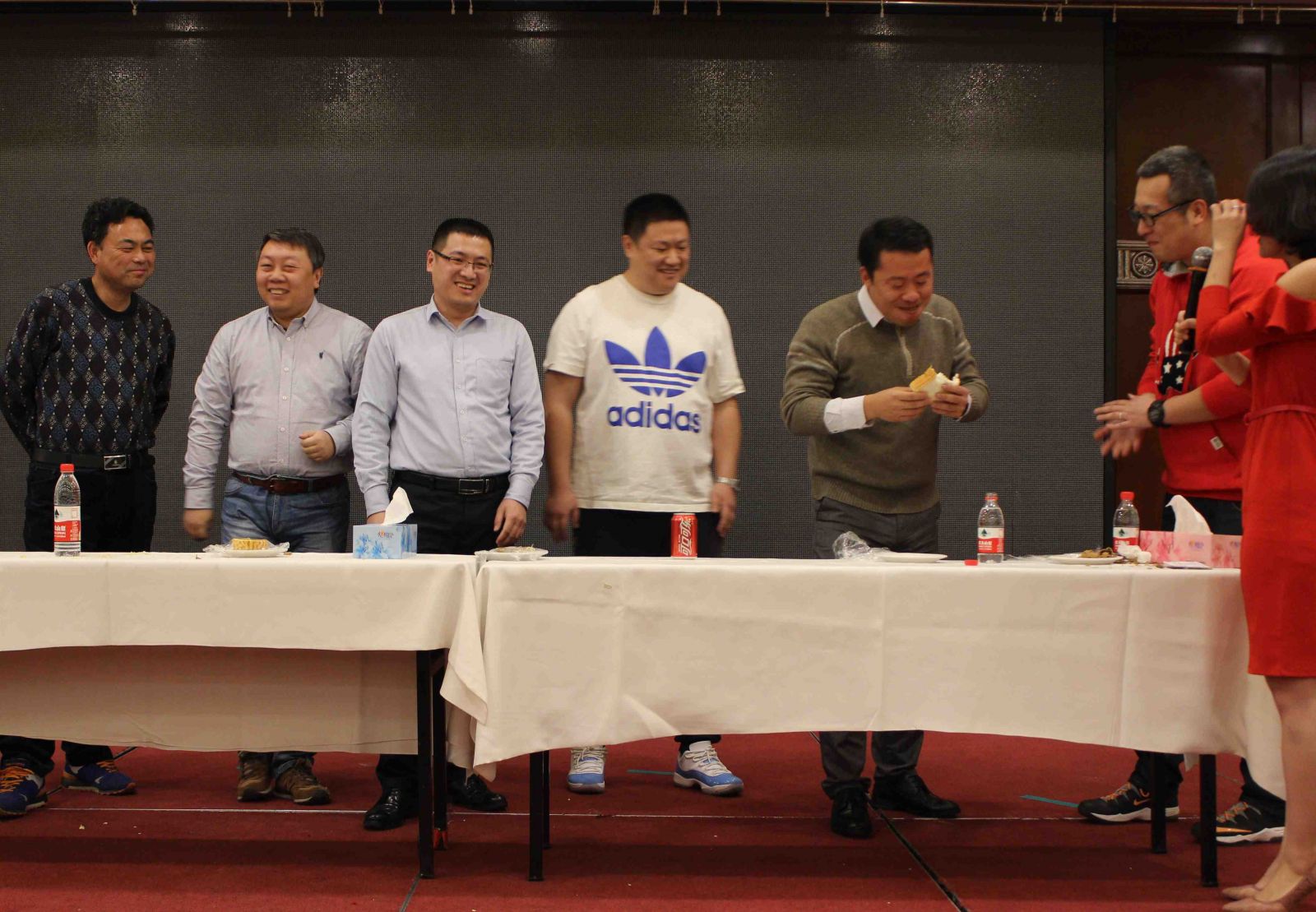 拓展環(huán)節(jié)將氣氛推向了高潮,滿場歡聲笑語。"吃掉甜甜圈"、"我愛記歌詞"、"歌曲猜猜猜"、"嘴的盛宴"等游戲涌現(xiàn)出了一批高手,凸顯了天順人才濟濟。尤其是"嘴的盛宴",隊員們在徐欣董事長的帶領(lǐng)下團結(jié)協(xié)作,攻克難關(guān),最終成功完成了任務(wù)。"團結(jié)"、"克難"、"聚力"、"共贏"貫穿整個拓展環(huán)節(jié),每位家人都受益匪淺。
