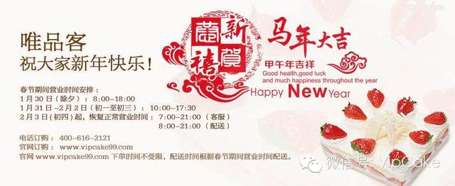 馬年,一個(gè)活力十足,激揚(yáng)澎湃的年份,唯品客在這喜悅的時(shí)刻,真心的感謝過(guò)去的時(shí)光中給予我們關(guān)懷和幫助的好朋友們!馬年春節(jié)期間,我們將開(kāi)足馬力不停歇,為您和您的家人送上新鮮美味的唯品客真心之作!